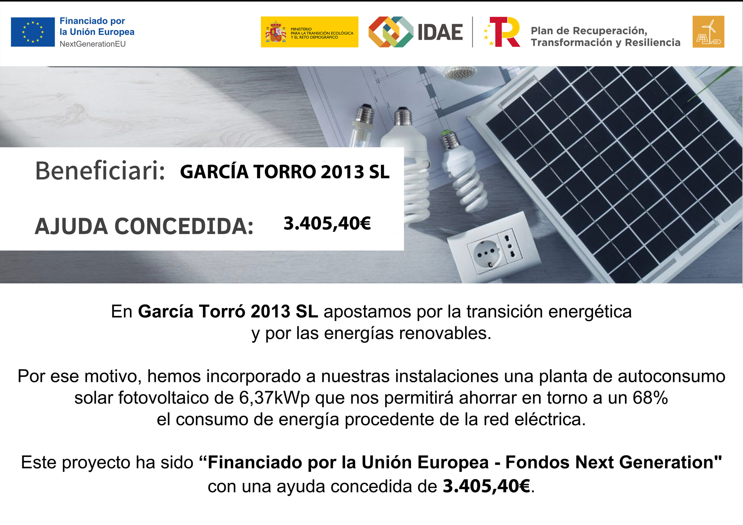 Incorporación planta de autoconsumo solar fotovoltaico En GARCÍA TORRÓ 2013 SL apostamos por la transición energética y por las energías renovables. Por ese motivo, hemos incorporado Abrir noticia
